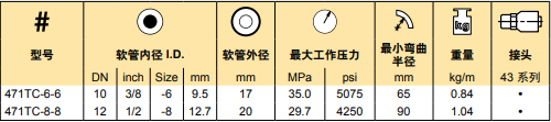 適用介質:石油基液壓油,水乙二醇,潤滑油,空氣和水。用于1.7MPa以上的空氣時,軟管需針刺。
