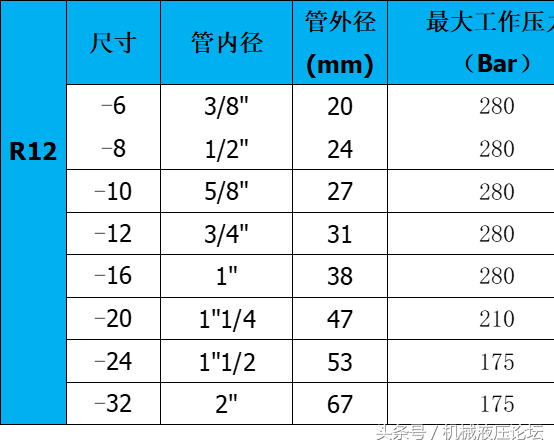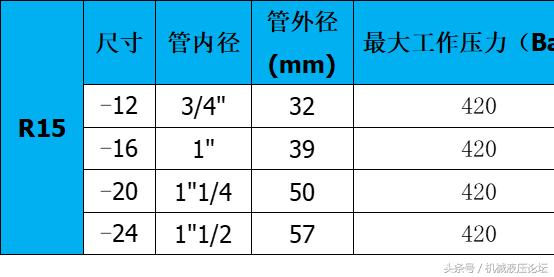 附:常用液壓膠管內外徑及最高工作壓力參數