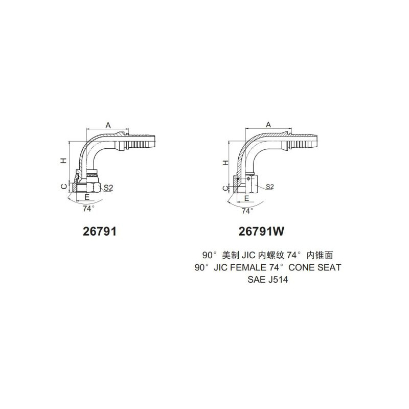扣壓式接頭 26791和26791-W 90°美制JIC內螺紋 74°內錐面